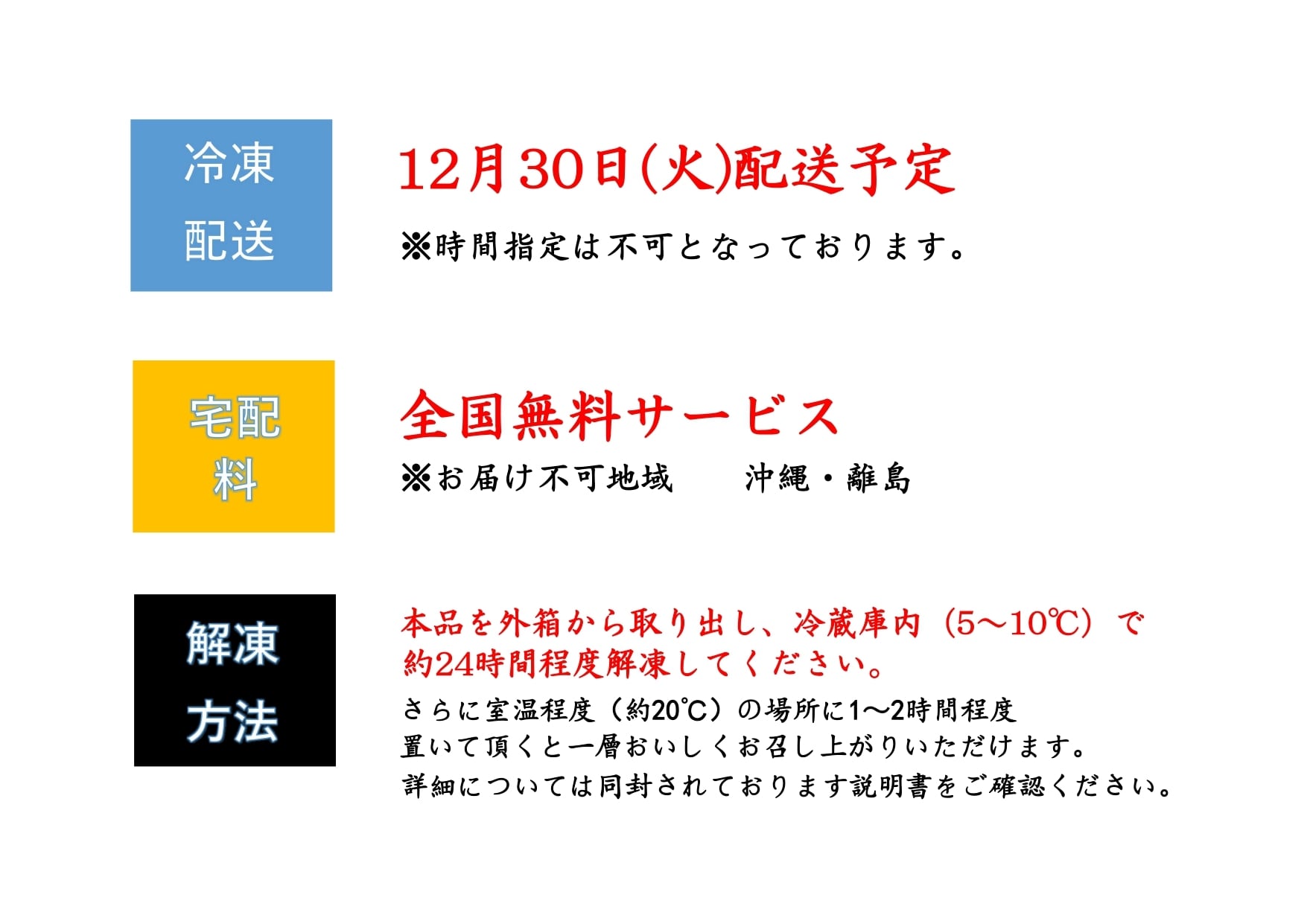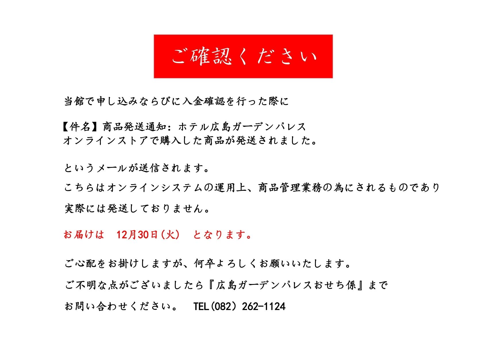 お申込みまたは入金確認後「商品発送通知」が送信されますが、実際の到着日は12月30日(火)となります。